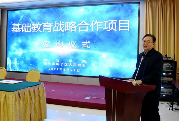 李东书记致辞时指出,在潍坊市各级党委政府的支持下,潍坊学院经过70年建设,构建了完整的学科专业体系,整体办学水平大幅度提高;学校从1951年开始举办师范教育,高度重视教师教育学科和师范类专业建设,设立了15个师范类专业,为潍坊市输送了大批优质师资。潍坊学院是潍坊的大学,服务潍坊是义不容辞的责任。与基础教育快速发展的坊子区签署战略合作协议是一个重要的开始,在今后的合作中,潍坊学院将进一步投入更多力量,在经济社会发展多个领域扩大合作范围,共同搭建高层次人才共享和高水平研究平台,向坊子区输送高素质应用型人才,为坊子地方产业发展提供人才和科技支撑,大力促进科技成果转化,为坊子区域经济社会发展创造良好环境,为加快建设潍坊“生态、开放、活力、精致”的现代化高品质城市贡献力量。