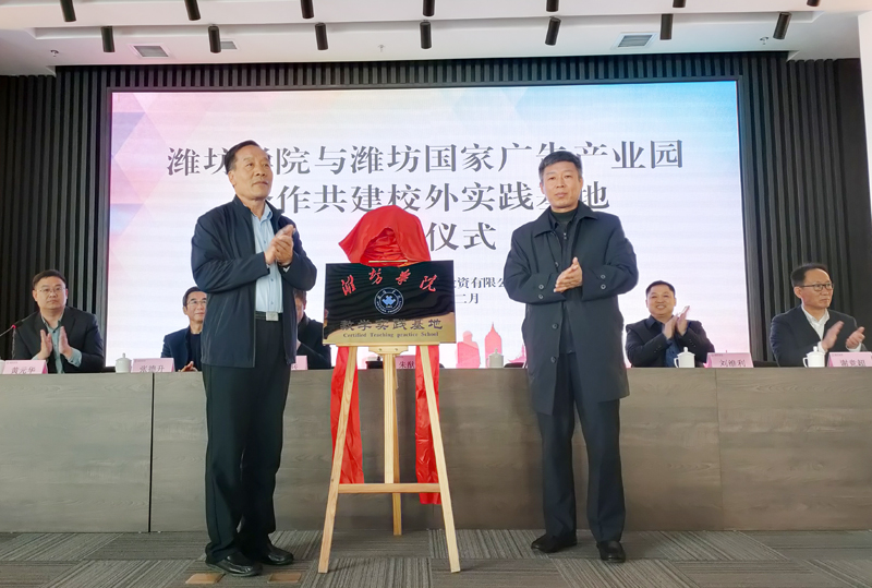 本网讯 12月7日,潍坊学院与潍坊国家广告产业园教学实践基地揭牌仪式在潍坊国家广告产业园举行。我校副校长朱猷武,潍城区委常委、宣传部部长武法栋,潍坊市十笏园文化投资有限公司总经理谢竞超出席仪式。