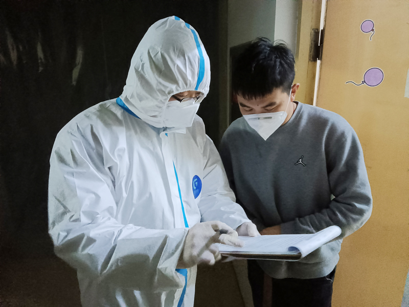 来到安顺当晚,韩锴主动要求承担最具风险的工作,下沉到抗疫最前线。凌晨1点多,他住进了该校区的居家健康监测中心,近距离服务在此居家健康监测的人员。因为居家健康监测人员不允许出房间门,所有的物资都需要工作人员送到门口,韩锴接到的第一个任务就是给刚入住的居家健康监测人员送饮用水。十九斤的桶装水,他一次提两桶,爬到五楼,挨个送到房间门口,来去往返好多趟。此后居家健康监测中心便成了他所有的活动场所。作为居家健康监测中心的“大管家”,事无巨细都要由韩锴带领的管控服务小组负责,随时解决监测人员的问题和需求,一日三餐的发放、垃圾回收、打扫卫生,生活物资如香皂、卫生纸、垃圾袋等的传递与分发,还要负责监控每位隔离人员的身体状况,一日三统计,核酸检测、防疫消杀更是样样不漏。二百多斤的一个胖子,穿着防护服每天上下五楼无数次,汗透衣背是常态,困了就合衣坐在凳子上眯一会儿。