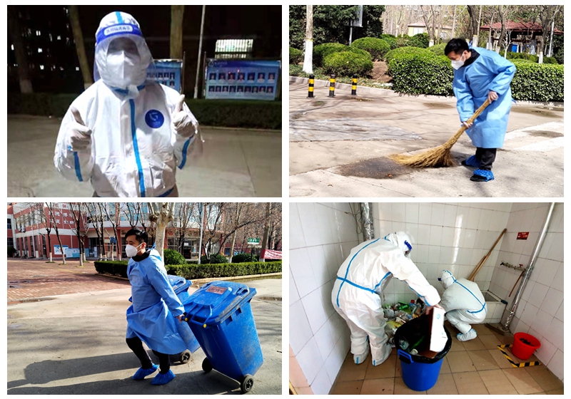 葛厚余在保障组的物业部门,负责整个校区的卫生工作,垃圾清运、道路清扫、餐厅卫生清理……这项工作范围广,工作量大,葛厚余始终要求自己精力体力都在线。每天清晨五点起床,穿戴好防护服后开始一天的垃圾清运,完成校区两千多师生每天日常垃圾的清运,八点半开始打扫餐厅,餐厅的桌凳要逐一进行擦拭消毒,之后清扫校园环境卫生。葛厚余博士说:“虽然这份志愿工作又脏又累,但只要是抗疫需要的,我们就会义无反顾,作为潍院人就要发扬潍院精神,能为抗击疫情尽一份力,我感到非常荣光。”