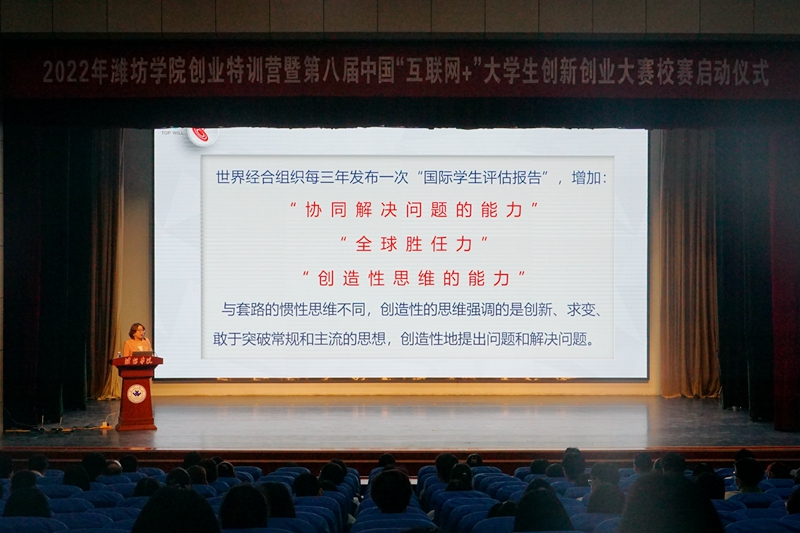 在此次启动仪式结束后,山东省十大金牌创业导师、山东拓维企业管理咨询有限公司董事长、潍坊学院创业导师沈福萍老师给全体参会人员进行了主题为“中国国际‘互联网+’大学生创新创业大赛背景及评审规则解读”的特训营开营第一讲。