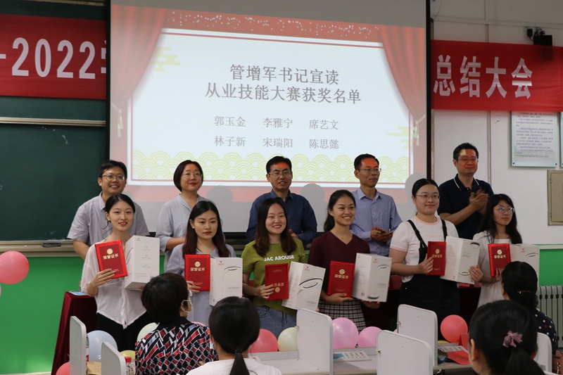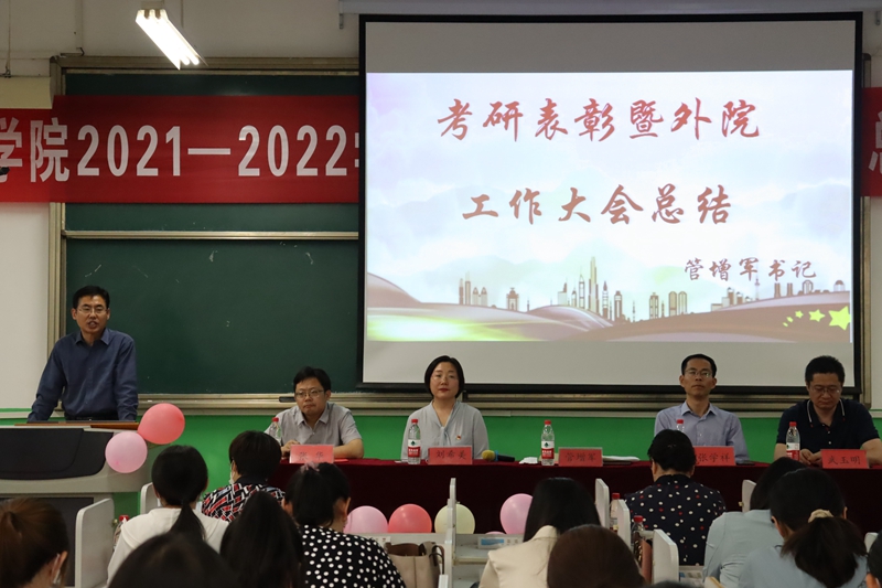 本网讯 为表彰先进、鼓励学子向优向好看齐,外国语学院于5月19日下午在至善楼召开“2021-2022学年考研表彰暨学生工作总结大会”。学院党总支书记管增军,院长张学祥,副书记刘希美,副院长武玉明、张华出席会议,各教研室主任、老师代表、受表彰学生以及各年级学生代表参加会议。
