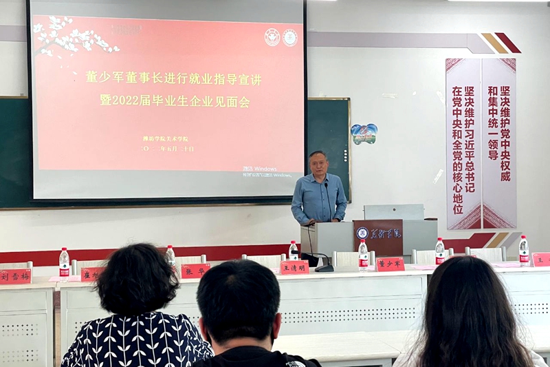 签约仪式后,校企双方领导在505会议室进行了深入沟通交流与互动,在加强校企之间深层次的交流与合作方面达成共识。董少军为美术学院2022届毕业生进行了专场招聘宣讲。