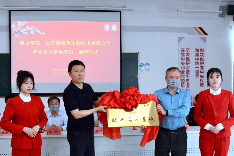 本网讯 5月20日,潍坊学院与山东海维芙生物技术有限公司共建学生就业实习基地签约揭牌仪式在荟萃楼501举行。校党委副书记王清明、山东海维芙生物技术有限公司董事长董少军出席仪式,合作发展处、学生工作处、美术学院相关负责同志,美术学院师生代表100余人参加。