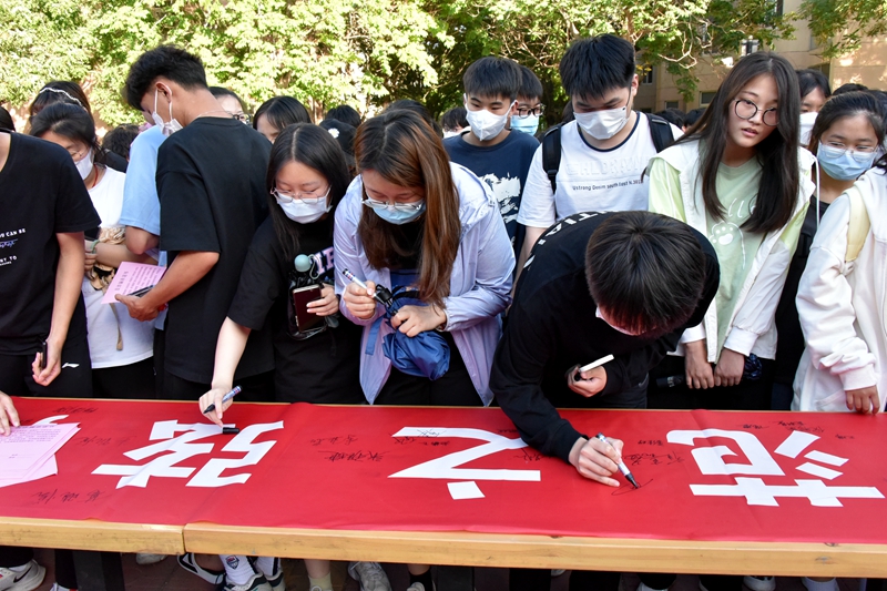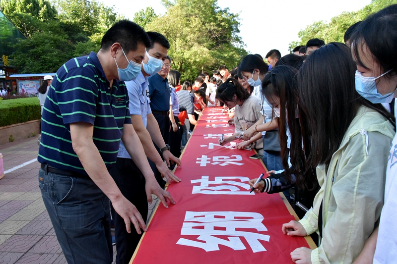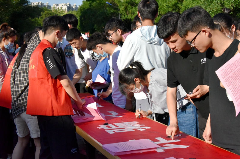 仪式后,与会人员在反诈防骗宣传横幅上签字留念,潍坊学院大学生安全委员会的同学们发放了反诈宣传资料,讲解了防骗方法,并发放和回收了反诈承诺书。