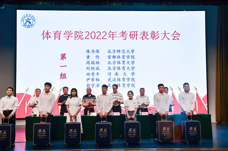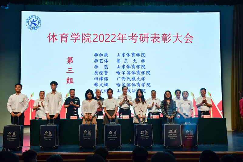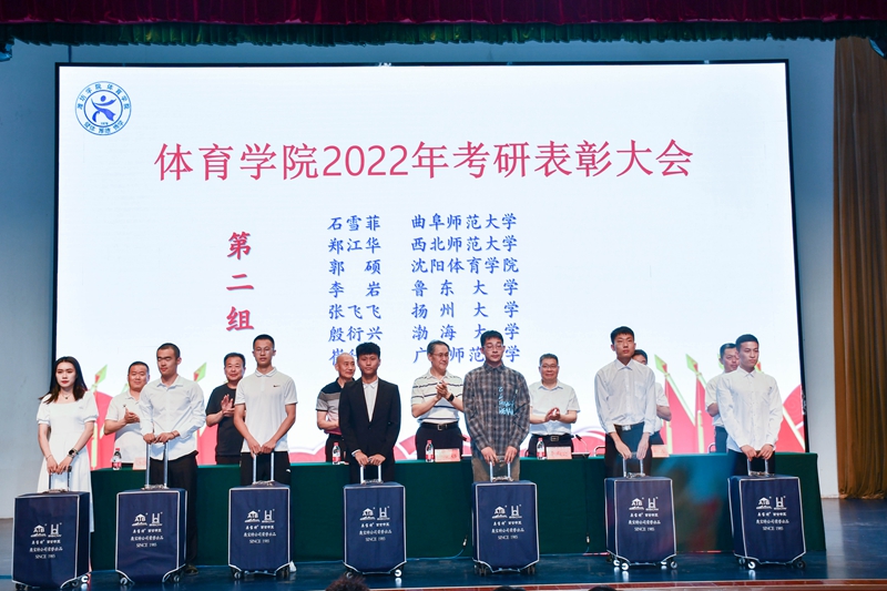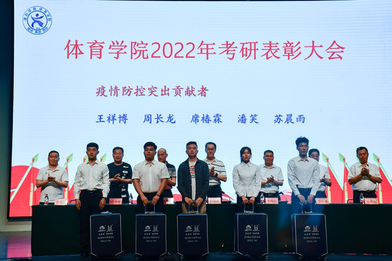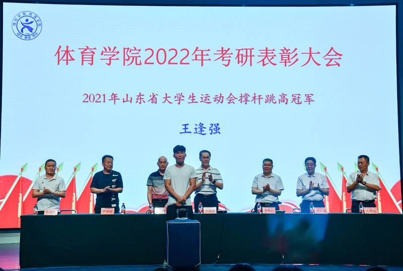 在2022年研究生考试中,体育学院有21名同学考上心仪的院校,其中2名同学考取北京体育大学,4名同学考取双一流大学,1名同学跨专业考取法律专业研究生。参会领导为研究生考试中取得优异成绩的同学、疫情防控作出突出贡献的同学、2021年山东省大学生运动会撑杆跳高冠军颁奖。