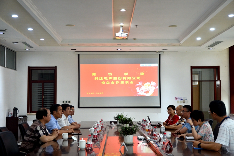 随后,校企双方就共建产业学院,并以产业学院为平台推进全方位深维度校企融合等事宜进行了热烈地讨论。朱猷武对潍坊学院与共达电声股份有限公司开启友好合作新篇章给予了充分肯定,并基于专业领域和研发方向的高度一致,对潍坊学院物理与电子信息学院与共达电声股份有限公司共建学科专业、共创人才培养模式寄予了展望。朱猷武表示,校企双方在学生创新与实践能力培养、带动学生就业、对接企业和社会需求、促进科技成果转化、共建专业实验室、共申高水平项目、共建团队共享人才等多个方面都存在巨大的可探讨合作的空间,希望校企双方共同努力,密切沟通交流,精准对接双方需求,全力以赴推进产业学院落实落地。