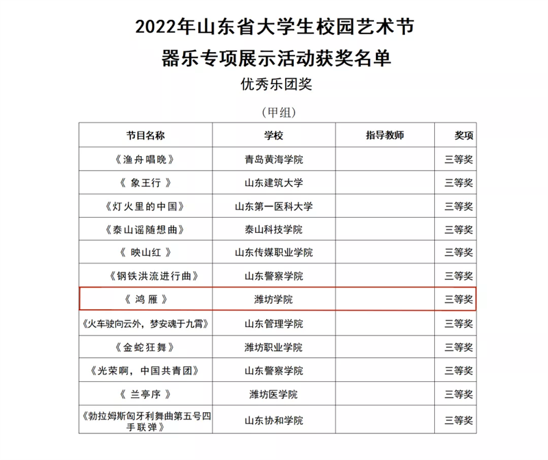 本网讯 日前,由省教育厅主办的2022年山东省大学生校园艺术节器乐专项展示活动评选结果公布。我校学生社团元素音乐社荣获优秀乐团奖三等奖。