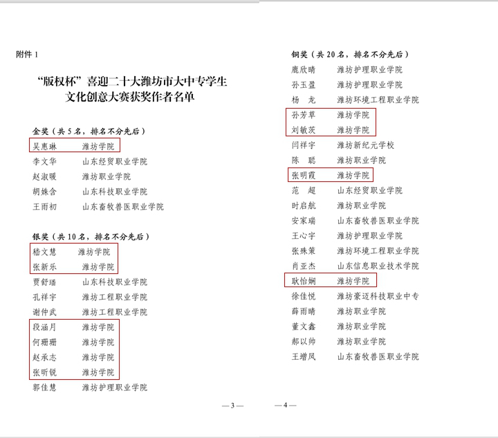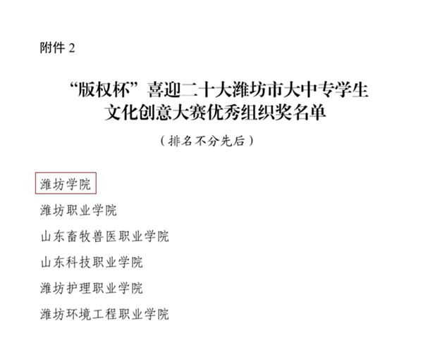在由潍坊市创建全国版权示范城市工作专班办公室、共青团潍坊市委员会、齐鲁文化(潍坊)生态保护区服务中心联合组织举办的“版权杯”喜迎二十大潍坊市大中专学生文化创意大赛中,我校荣获金奖1项,银奖6项,铜奖4项,并荣获优秀组织奖。