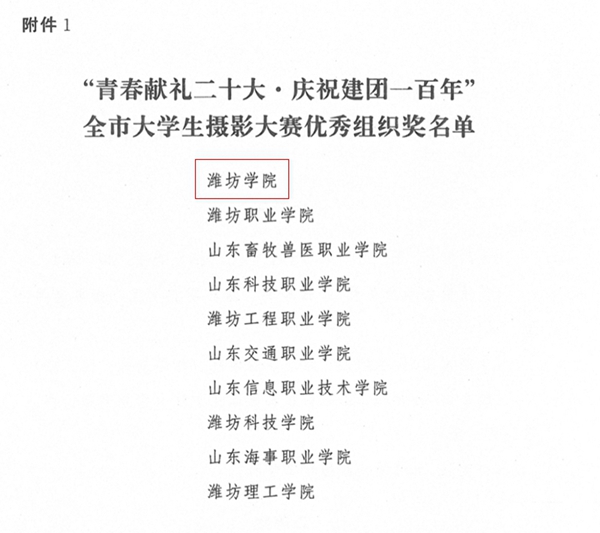 本网讯 日前,“青春献礼二十大·庆祝建团一百年”潍坊市大学生摄影大赛结果以及“版权杯”喜迎二十大潍坊市大中专学生文化创意大赛获奖名单相继公布,我校斩获多项奖项。