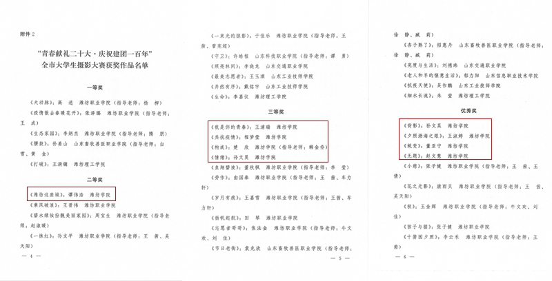 潍坊市大学生摄影大赛由共青团潍坊市委、潍坊市文学艺术界联合会、潍坊市青年联合会、潍坊市学生联合会、潍坊市青年摄影家协会联合举办,以培养大学生“探寻美、发现美、记录美、传播美”的能力,提高其审美水平和艺术素养。经专家组严格评审,我校《潍坊这座城》等9幅作品分获二、三等奖及优秀奖,学校荣获大赛优秀组织奖。