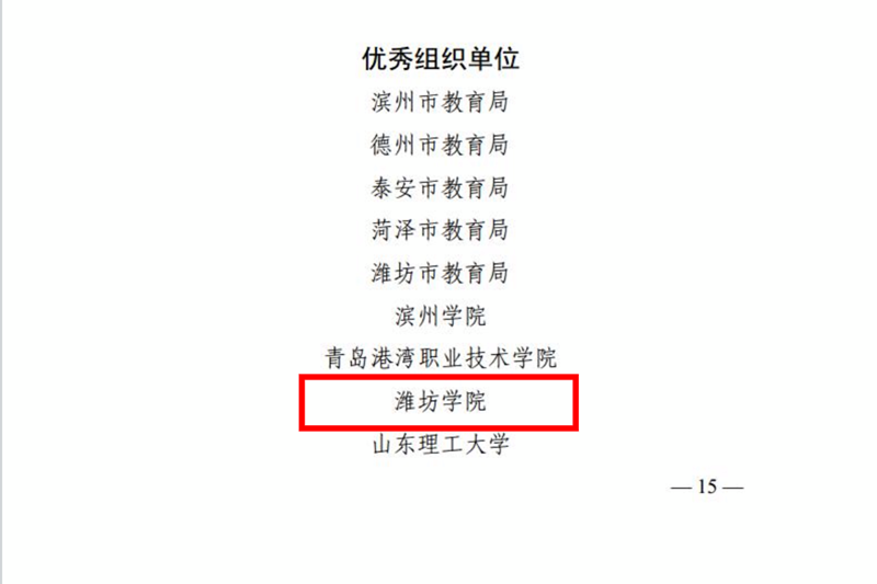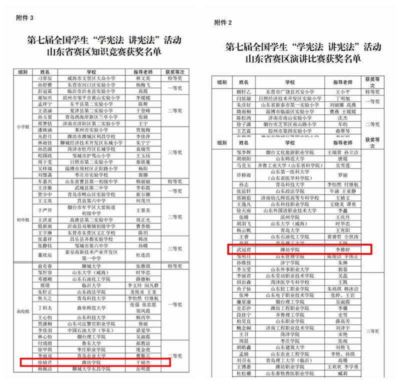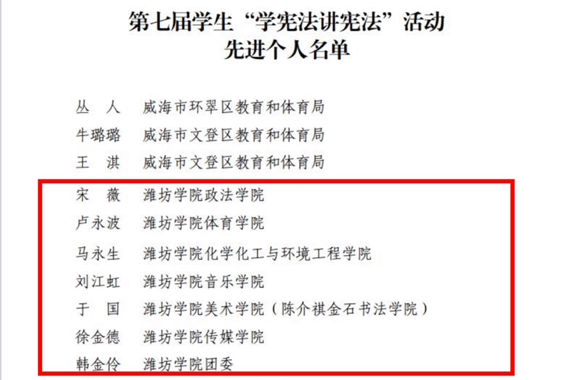 本网讯 日前,山东省教育厅公布了《关于第七届学生“学宪法 讲宪法”活动开展情况的通报(鲁教法函〔2023〕1号)》,我校喜获12项集体和个人表彰。其中,潍坊学院荣获优秀组织单位;政法学院徐婧芹同学获山东省赛区知识竞赛高校组二等奖;政法学院武冠君同学获山东省赛区演讲比赛高校组二等奖;于丽杰、李雅婷获优秀指导老师;宋薇、卢永波、马永生、刘江虹等7位老师获第七届学生“学宪法 讲宪法”活动全省先进个人。