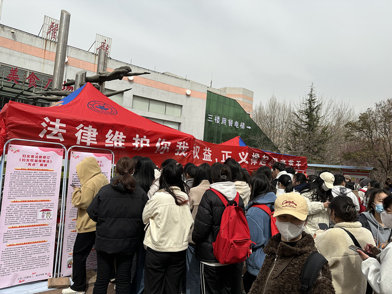 本网讯 为宣传贯彻新修订的《中华人民共和国妇女权益保障法》和《消费者权益保护法》,3月15日,由学校工会主办、政法学院承办的“法律维护你我权益,正义撑起弱者蓝天”普法宣传活动在第二餐厅前火热进行,拉开了普法宣传月活动的序幕。