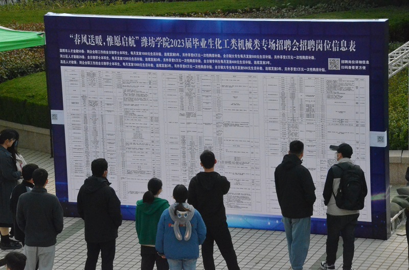 本网讯 3月18日,学校2023年“春风送暖,惟愿启航”化工类机械类专场招聘会在天一楼院内广场成功举办。学生工作处、化学化工与环境工程学院、机械与自动化学院相关负责同志来到招聘会现场,与带领企业参会的山东化工专业人才市场服务中心、淄博市临淄区人力资源和社会保障局、淄博市淄川区人力资源和保障局、东营市河口区人力资源和社会保障局、昌邑市人力资源和社会保障局的同志进行了友好交流,并与参会用人单位、参会学生亲切交流,耐心询问毕业生的就业意向和求职应聘进展,认真听取用人单位对我校毕业生的就业反馈和对学校人才培养的意见建议。