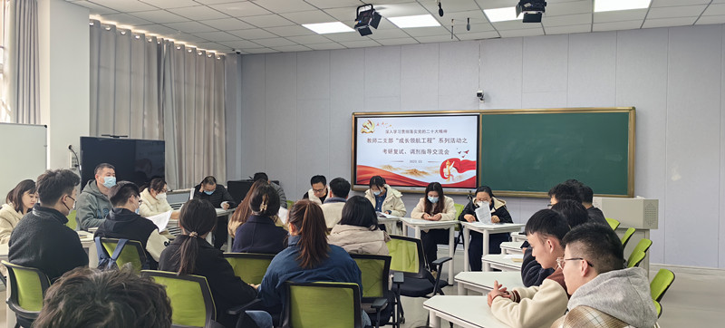 本网讯 为促进2023届毕业生更好地备战研究生复试及调剂工作,3月23日下午,计算机工程学院教师第二党支部在7302智慧教室举行“深入学习贯彻落实党的二十大精神”教师二支部“成长领航工程”系列活动之考研复试、调剂指导交流会。教师第二党支部9名教师、2019级辅导员以及本院20余名备战研究生复试、调剂的毕业生参加了活动。