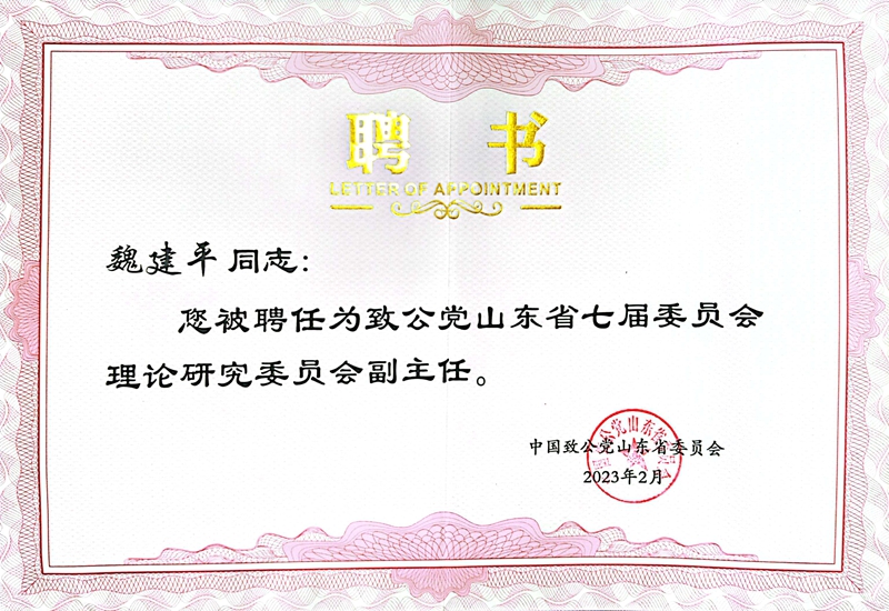 本网讯 近日,致公党潍坊学院支部主委魏建平,被致公党山东省委会聘为山东省第七届委员会理论研究委员会副主任。