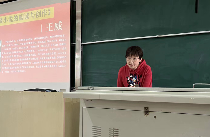 本次讲座由中国作家协会会员、山东省作家协会签约作家、潍坊市签约作家王威女士主讲,文史学院党总书记李学军、副院长赵红卫,潍坊市文联党组成员、副主席邱兆锋,潍坊日报社编委、全媒体运营中心总经理、潍坊市文艺评论家协会主席窦洁,潍坊市文联组联部主任黎斌,文史学院部分教师出席讲座。
