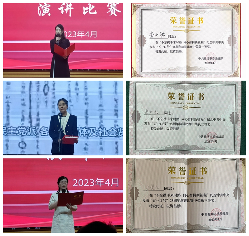 本网讯 4月24日,“不忘携手来时路·同心奋楫新征程”潍坊统一战线纪念中共中央发布“五一口号”75周年演讲比赛举行。我校3位参赛教师分别获得一二三等奖的优异成绩。