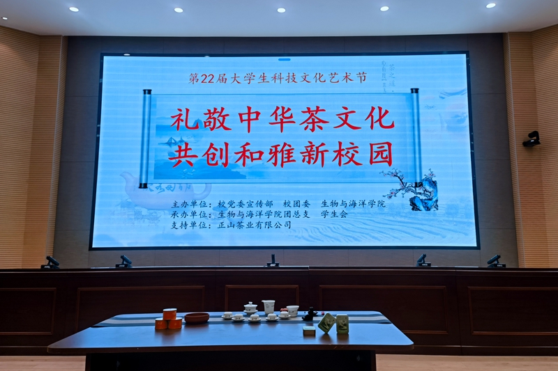 本网讯 为继承和发扬优秀中国传统文化,增强大学生的文化自觉和文化自信,5月11日晚,学校举办“礼敬中华茶文化 共创和雅新校园”茶文化传播交流活动。校团委书记徐加金、生物与海洋学院党总支书记于恬、副书记黄本玉出席活动,学院师生代表及茗韵国学社社团成员参加活动。