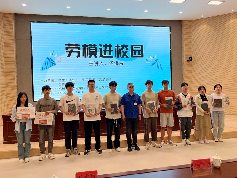 本网讯 为倡导广大青年学生学习劳模故事,弘扬工匠精神,5月16日下午,学生工作处(学生工作部、武装部)、合作发展处联合机械与自动化学院(潍柴产业学院)举办“劳模进校园”宣讲活动。潍柴动力股份有限公司首席技师、“全国五一劳动奖章”获得者、齐鲁大工匠汤海威师傅受邀为同学们作主题讲座,160余名师生参加了活动。