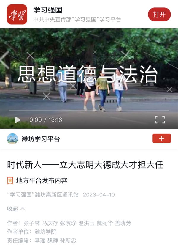 本网讯 近日,由马克思主义学院张子林教授主持,马庆存、 张淑珍、 温洪玉、 盖晓芳等教师主讲的《思想道德与法治》课程被推送至“学习强国”学习平台,这是继我校《思想道德与法治》课程获得国家一流本科课程之后又一新突破。