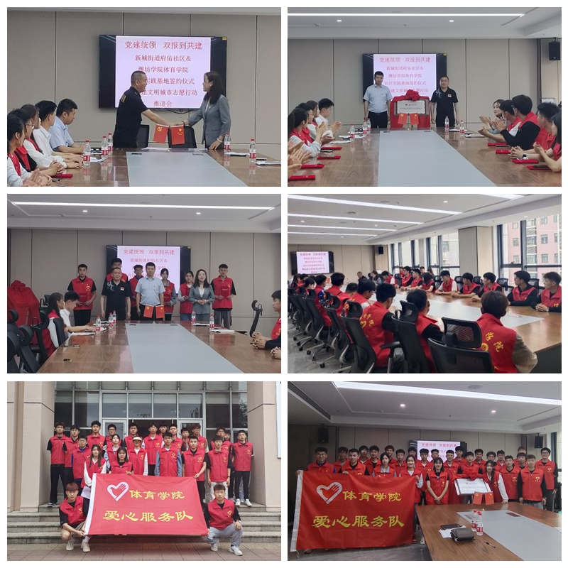 本网讯 5月18日,为提高大学生适应社会能力,秉承让大学生在实践中受教育、长才干、作贡献的宗旨。体育学院联合新城街道府佑社区举行“党建统领、双报到共建”社区实践基地签约仪式暨创建文明城市志愿行动推进会。新城街道党工委委员、政法委员张军,府佑社区党委书记李欣,体育学院团总支(学工办)书记(主任)卢永波出席此次活动,体育学院爱心服务队骨干成员参加活动。