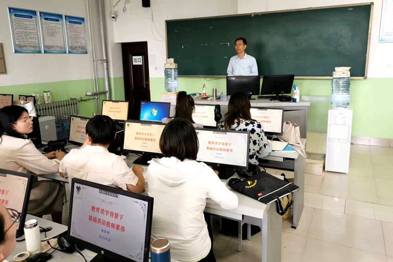 本网讯 5月25日,外国语学院院长张学祥教授为安丘市初中英语骨干教师核心素养提升班作了“教育美学背景下基础英语教师素养”的报告。张教授的报告以丰富翔实的案例、妙趣横生的语言阐释了教育美学的理念与意义,围绕“美育是一个人的核心竞争力”,以“优雅是一种态度”为主题,从跨学科“共同体”意识、历时教学“共同体”意识、减负赋能的留白之美等六个方面就新时代基础英语教师的素养提升提出了自己的建议。然后,从教育环境之美、教师之美、教学内容之美、教学活动之美四个维度,与培训班的老师们分享了外国语学院以“美”为理念进行的教学实践活动。