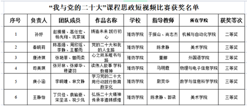 本网讯 近日,山东省高等学校课程思政研究中心公布了“我与党的二十大”课程思政短视频比赛获奖名单,我校机械与自动化学院(潍柴产业学院)孙妤团队荣获二等奖,美术学院(陈介祺金石书法学院)秦晓莉团队和王静怡团队、外国语学院康诗琪团队、物理与电子信息学院(量子信息技术研究院)司美琪团队、数学与信息科学学院庚小涵团队荣获三等奖。