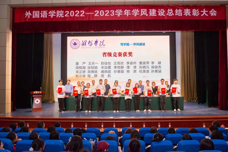 本网讯 近日,外国语学院在图书馆报告厅举办2022-2023学年学风建设总结表彰大会。学校学生工作处处长姜廉毅、教务处处长侯金奎、团委书记徐加金,山东英迈教育科技有限公司总校长陈娜娜,外国语学院党总支书记管增军、院长张学祥、副院长张华、院长助理王珂、刘雪林等部门负责人出席。大会由外国语学院党总支副书记刘希美主持。学院部分教师代表、各年级辅导员、优秀毕业生和优秀学生代表、2021级和2022级全体学生参加大会。