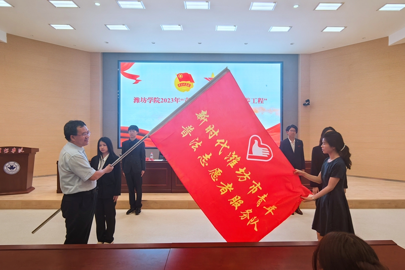 刘世海代表市委统战部为学校新时代青年普法志愿者服务队授旗。