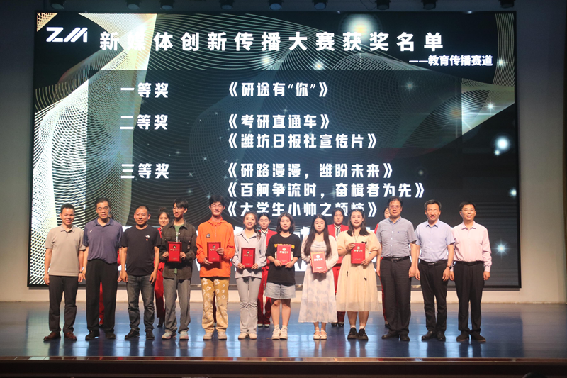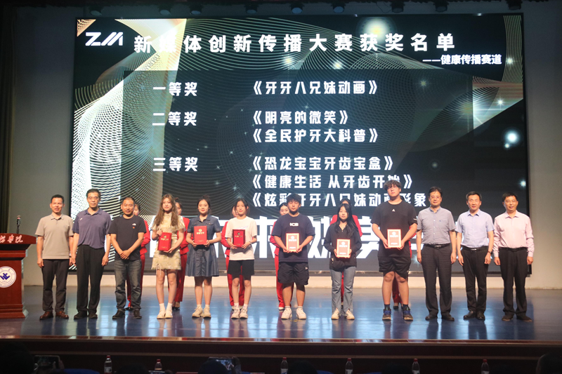 本网讯 6月19日,学校第22届大学生科技文化艺术节“传创未来,媒美与共”新媒体创新传播大赛颁奖典礼,在图书馆报告厅举行。校党委宣传部副部长赵鹏俊、传媒学院党总支书记卢运山、副书记刘先学、副书记副院长韩殿元、院长助理付雯雯、潍坊日报社教育培训中心主任刘建强、山东牙道医疗科技有限公司总裁李世平、书记张培成出席典礼,获奖选手和传媒学院部分学生参加活动。