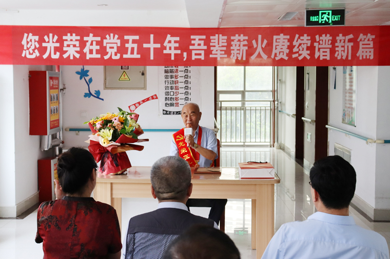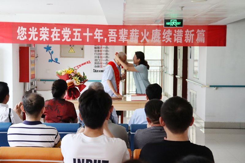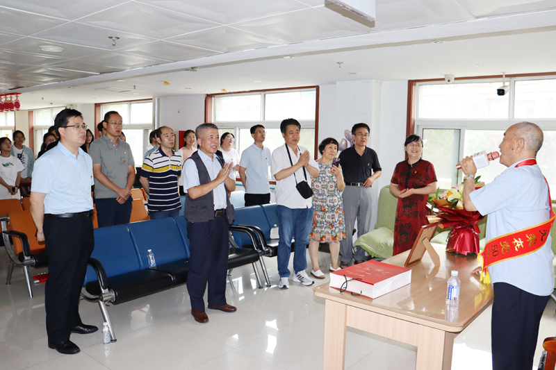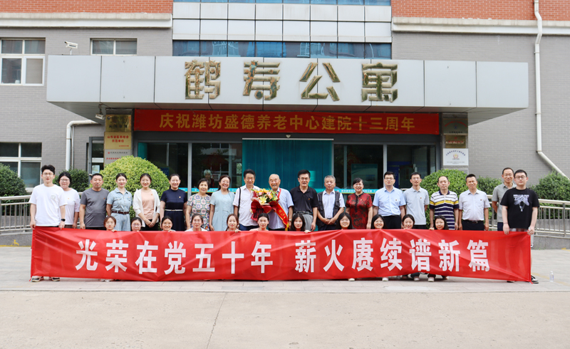 本网讯 7月6日,为薪火赓续,传承初心使命,走好新时代赶考路,数学与信息科学学院党员代表30人以及学生志愿者前往潍坊鹤祥安养中心活动室,看望老党员杨家骐同志,数学院老中青三代党员齐聚一堂,开展主题党日活动,庆祝老党员杨家骐同志光荣加入党组织五十周年,传承红色精神。