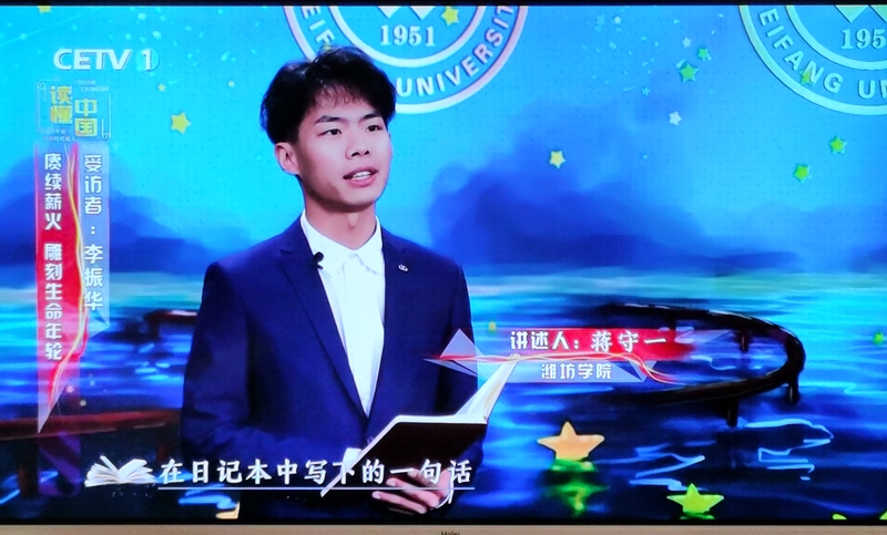 本网讯 7月7日晚,中国教育电视台一套播出了教育部关工委2022年“读懂中国”活动优秀作品展播节目。我校传媒学院学生蒋守一作为这个节目的讲述者之一登上中国教育电视台。他讲述的是《赓续薪火,雕刻生命年轮》,该文章获得2022年教育部关工委“读懂中国”活动最佳征文奖,作者为政法学院法学专业2020级1班吴楷文同学,征文指导教师于丽杰,受访者(文内的主人公)为沂源县实验中学原校长李振华。