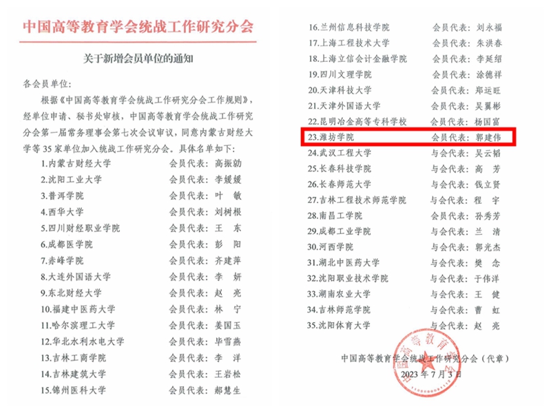 本网讯 近日,根据中国高等教育学会统战工作研究分会第一届常务理事会第七次会议审议,潍坊学院加入统战工作研究分会。