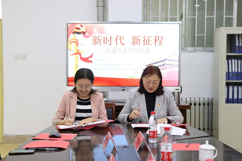 本网讯 为深入学习贯彻习近平新时代中国特色社会主义思想,贯彻落实党的二十大精神,以党建共建为引领,不断提高党支部创造力、凝聚力、战斗力,10月10日,数学与信息科学学院党总支与奎文区梨园街道樱南社区,党建共建签约仪式举行。数学院党总支书记周莹、院长李梅霞、党总支副书记郑栋鹏、正科级组织员张德辉参加会议。