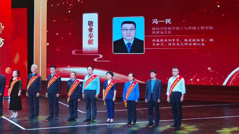 本网讯 10月13日下午,第九届潍坊市道德模范发布仪式暨现场交流活动举行,共有助人为乐、见义勇为、诚实守信、敬业奉献、孝老爱亲五大类37人获评第九届潍坊市道德模范,其中,我校化学化工与环境工程学院冯一民老师获“敬业奉献”类道德模范称号。