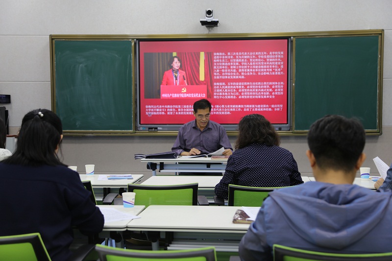 小组组长、传媒学院党总支副书记刘先学带领小组成员认真学习了徐梅书记《凝心聚力求突破 挺膺担当铸新篇 为建设国内一流应用型大学而不懈奋斗》工作报告,回顾了过去五年学校取得的工作成绩和丰富经验,明确了未来五年学校工作的总体要求,加深了对以高质量党建引领学校事业高质量发展的理解认识。刘先学指出,学校第四次党员代表大会是一次关键时刻、意义非凡的大会,要充分认识学习贯彻大会精神的重要意义,深刻领会大会的基本精神和目标要求。特别是作为思政工作者,更要提高思想认识,发挥自身能力,增强工作实效。