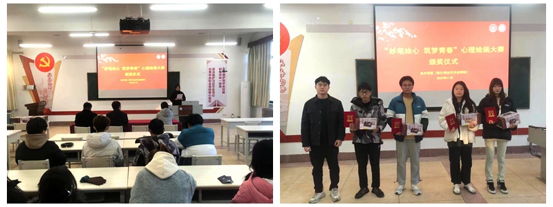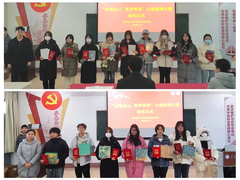 本网讯 为提升师生心理健康素养,强化心理健康教育工作队伍建设,促进美术学院心理辅导站建设,着力营造积极向上、和谐互助的校园氛围,美术学院(陈介祺金石书法学院)于11月29日在1501召开“妙笔绘心 筑梦青春”心理绘画大赛颁奖仪式。心理教育咨询中心杨京霖,正科级辅导员陈菲菲,心理辅导站站长王梦琪,心理健康绘画大赛50位获奖人员参加活动。