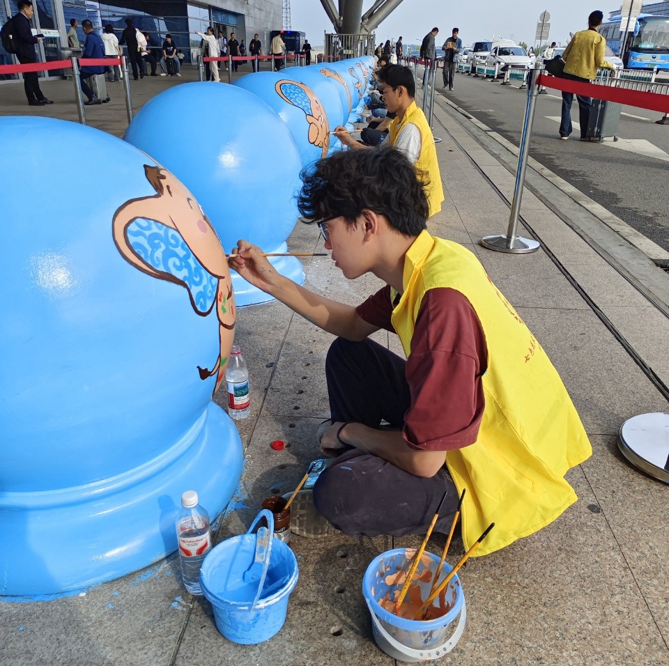 9月26日至28日,潍坊学院美术学院“七色花”大学生志愿服务队、尽美社及大学生书画社团的志愿者,分赴潍坊站、潍坊北站开展主题创作。志愿者以“潍坊象”为元素,手持画笔从线稿勾勒到色彩填充,历时3天完成90余个石墩的绘制。画中“潍坊象”形象亲切可爱,既承载着“潍坊有象,万象更新”的寓意,更将潍坊热情、开放、友好的城市气质融入笔触,让静态石墩成为传递城市文化的“活载体”。