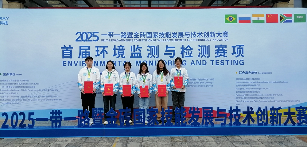 10月19日,2025一带一路暨金砖国家技能发展与技术创新大赛首届环境监测与检测赛项在湖南落幕,我校化学化工与环境工程学院代表队表现优异,获得一等奖(金牌)1项、二等奖(银牌)2项。