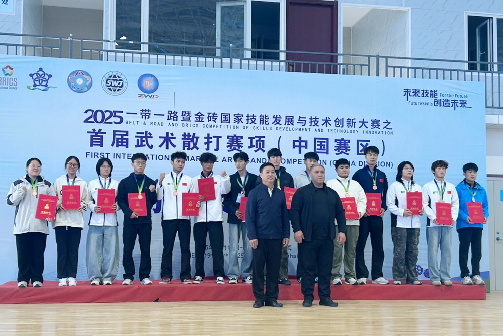 10月25日,2025一带一路暨金砖国家技能发展与技术创新大赛首届武术散打赛项落下帷幕,我校体育学院代表队获一等奖(金牌)1项、二等奖(银牌)1项、三等奖(铜牌)2项。