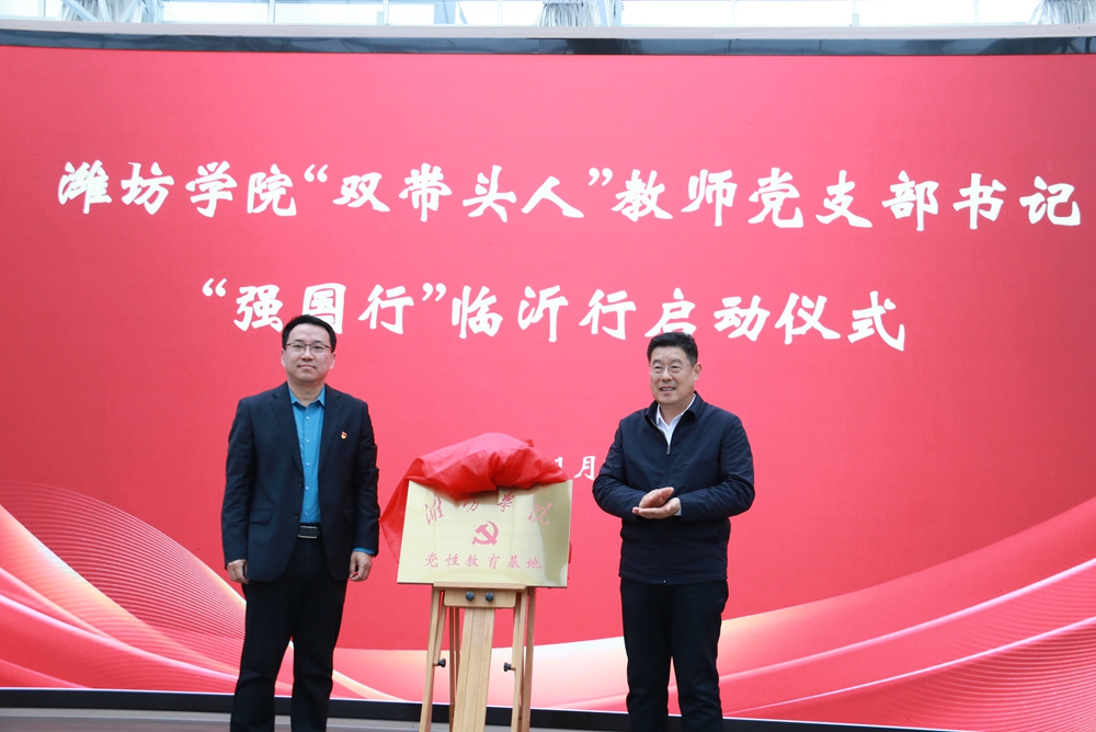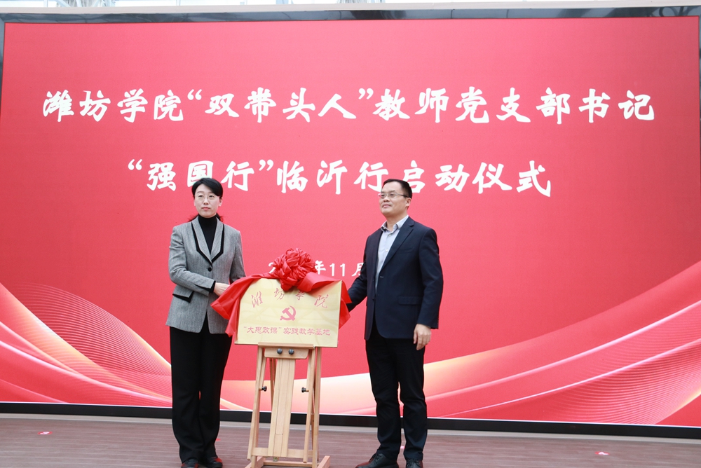 本网讯 11月7日,山东省教育厅、潍坊学院党支部党建联建暨潍坊学院“双带头人”教师党支部书记“强国行”专项行动临沂行活动启动仪式在临沂市郯城县举行。省教育厅总督学袁广全,学校党委书记来逢波,郯城县委副书记、县长于广威出席并致辞,省教育厅学校组织处处长扈航、专职组织员蒋文莉、副处长彭洪文和人事处(高等学校干部处)副处长王猛,学校党委副书记王守全,党委委员、组织部部长赵加强,临沂市政府总督学王金锋,郯城县委副书记、省派工作队牵头负责人姜廉毅,郯城县委委员、组织部部长杨晓莉出席活动。