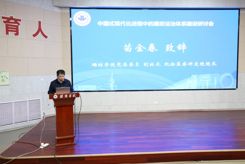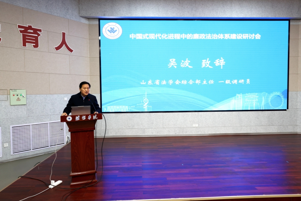 本网讯 12月27日,“中国式现代化进程中的廉政法治体系建设”研讨会在学校召开。山东省法学会综合部主任、一级调研员吴波出席开幕式并致辞。潍坊市委常委、市纪委书记、市监委主任田兵兵,潍坊市委政法委副书记、市法学会党组书记、常务副会长李春野,潍坊市社科联党组书记、主席李磊,学校党委书记来逢波,党委委员、副校长、纪检监察研究院院长苗金春,党委委员、纪委书记、监察专员武玉杰等出席会议。