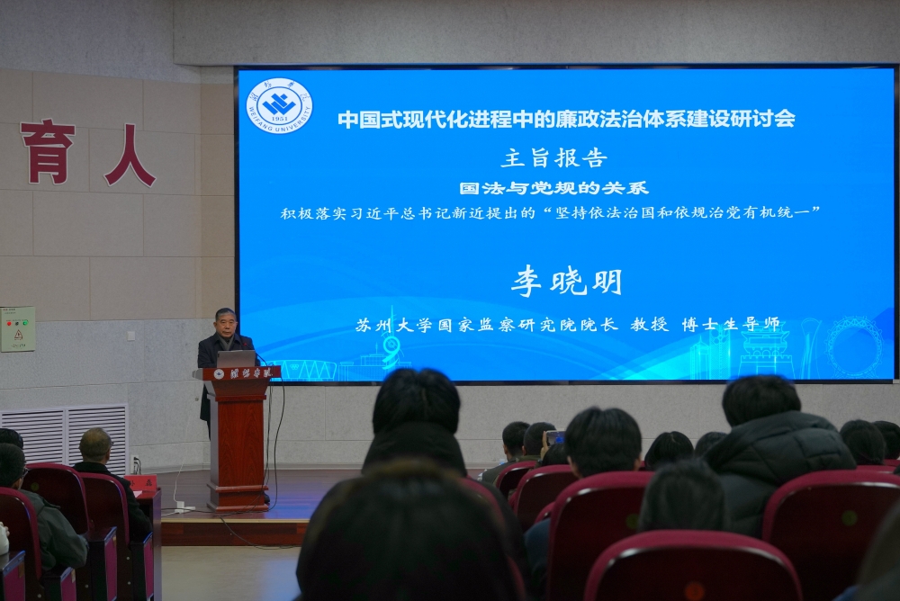本次学术研讨会分为主旨报告、主题报告和分组讨论三个阶段。主旨报告环节,山东大学二级教授、博士生导师、纪检监察学科带头人、山东省法学会副会长肖金明作题为“建构以廉政学为基础的纪检监察学科体系”的报告。他提出构建以廉政学为基础的学科架构,通过优化学科生态、完善知识体系结构、明确学理内核及运用科学方法论,推动纪检监察学科自主知识体系发展。苏州大学国家监察研究院院长、教授、博士生导师李晓明作题为“国法与党规的关系:积极落实习近平总书记新近提出的‘坚持依法治国和依规治党有机统一’”的报告,深入解读了依法治国与依规治党有机统一的深刻内涵与内在关联。