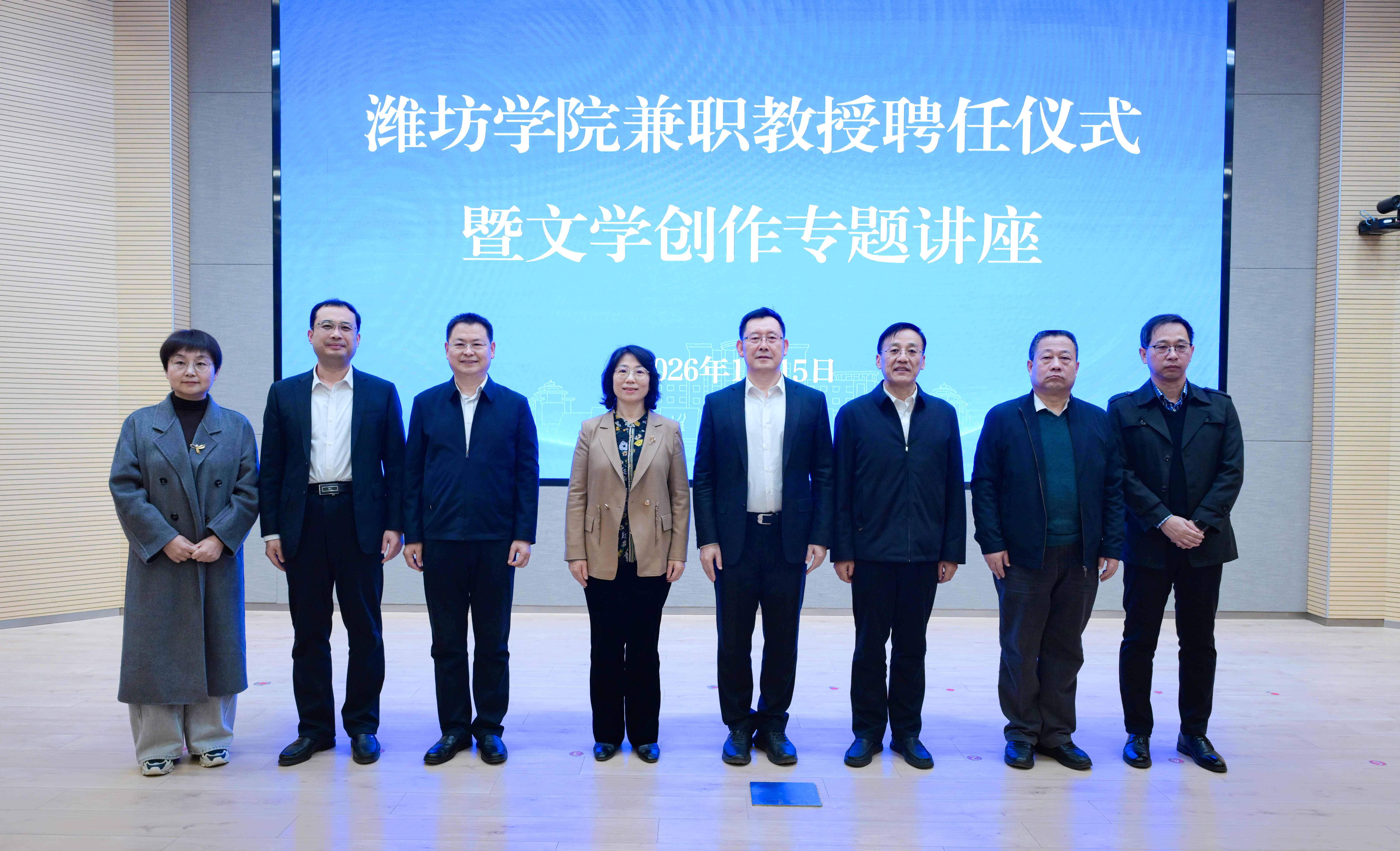 本网讯 1月15日,学校举行兼职教授聘任仪式暨文学创作专题讲座活动。潍坊市委常委、宣传部部长杨建华,学校党委书记来逢波,党委副书记、校长王霞,潍坊市文化和旅游局党组书记、局长高强,潍坊市文学艺术界联合会副主席范德祥,中国作家协会会员、山东省作协全委会委员、潍坊市政协委员王威,中国作家协会会员、山东作协全委会委员、诸城市作家协会主席黄鑫出席活动,学校党委委员、副校长任立春主持活动。