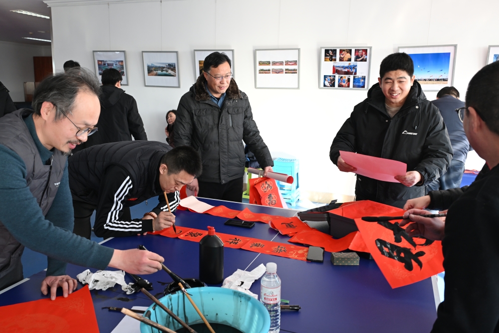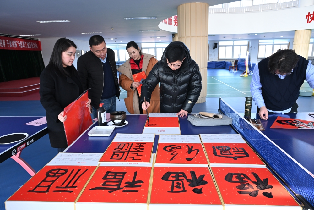 活动现场,多位教师挥毫泼墨、笔势遒劲,一幅幅寓意吉祥的春联、一张张风格各异的“福”字跃然纸上。联语中藏着辞旧迎新的美好期许,笔墨间饱含平安喜乐的真挚祝福,既尽显中国传统书法艺术的博大精深与独特韵味,也传递出浓浓的年味儿。现场吸引了大批教职工驻足观赏,大家有序领取春联与“福”字,或相互交流品鉴书法佳作,或细细端详字句中的美好寓意,脸上满是喜悦,欢声笑语中洋溢着温馨祥和的氛围。