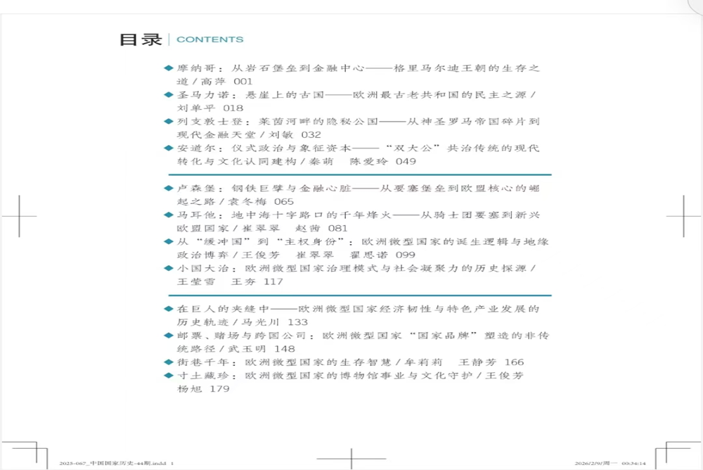 本网讯 近日,由我校区域国别研究院执行院长、文史学院学术院长陈德正教授、欧洲微型国家研究中心主任、法学院于民教授共同主编的《中国国家历史》第44辑——《欧洲微型国家的历史密码与生存智慧》一书,由东方出版社正式出版。本书由我校欧洲微型国家研究中心牵头组织,汇聚文史学院、外国语学院、法学院等单位的17位教师编撰而成。全书共收录12篇论文,聚焦摩纳哥、圣马力诺、列支敦士登等6个欧洲微型国家的千年演进历程,通过“邮票王国”列支敦士登、“两国共治”安道尔等典型案例,集结多学科力量,融合历史学、政治学、外国语言文学、经济学、文博旅游等多维视角,深入揭示这些国家在复杂地缘格局中的生存策略与治理智慧。