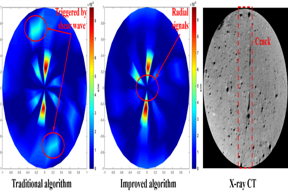 论文系统综述了超声波技术在建筑材料缺陷检测中的应用,阐述了超声波检测的基本原理、超声波计算机断层扫描(UCT)的优势,以及通过优化探头排列提升UCT信号准确性的方法。重点讨论了超声波技术在文物、水泥基材料和结构健康监测中的应用,并提出了一种增强型UCT算法。通过灵活排列收发探头和优化网格划分,减少了传统算法中剪切波导致的伪影,提升了成像质量和信号信噪比。该算法为提升非规则材料缺陷检测精度提供了新的思路,并为相关领域提供了理论参考和实践指导。