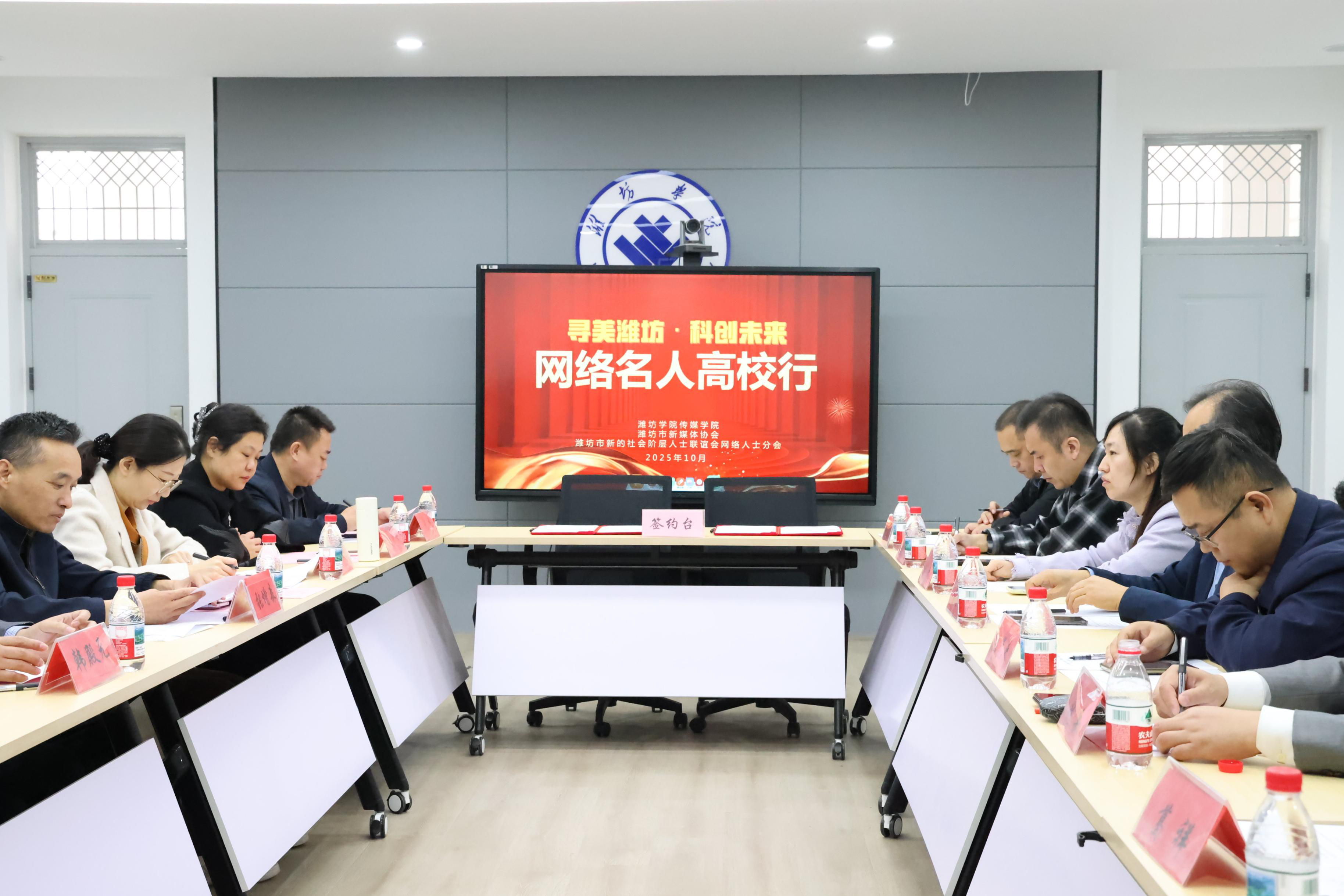 本网讯 10月17日,潍坊市新媒体协会高校调研行暨 “寻美潍坊 科创未来” 网络名人高校行活动在传媒学院举行。市委网信办副主任、二级调研员董序亮,潍坊市政协常委、潍坊市新媒体协会会长赵岳,学校统战部副部长张增森,传媒学院院长韩殿元等参加活动。活动由传媒学院党委书记张鲁筠主持。